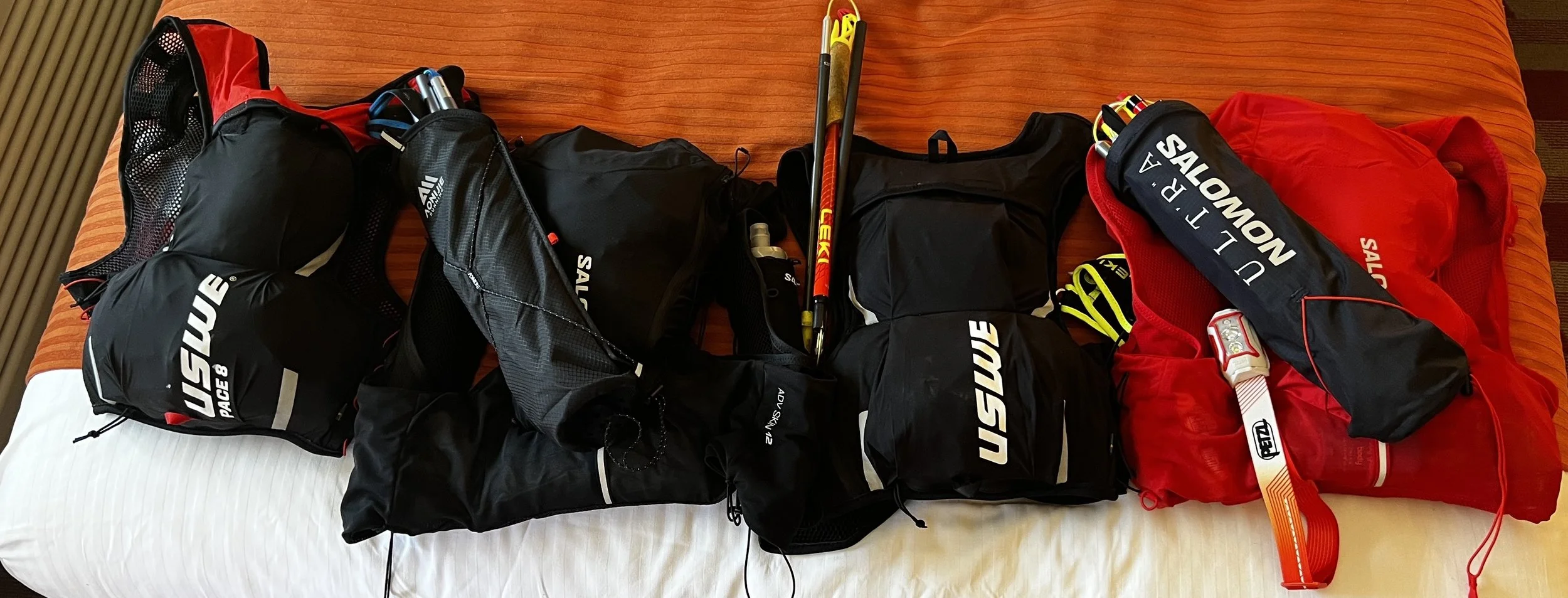 All the packs. Mine is the one on the right with the Salomon ADV Skin 12 and quiver holding my Leki UltratrailFX.one poles. Great set up!